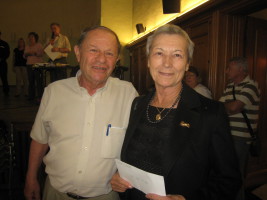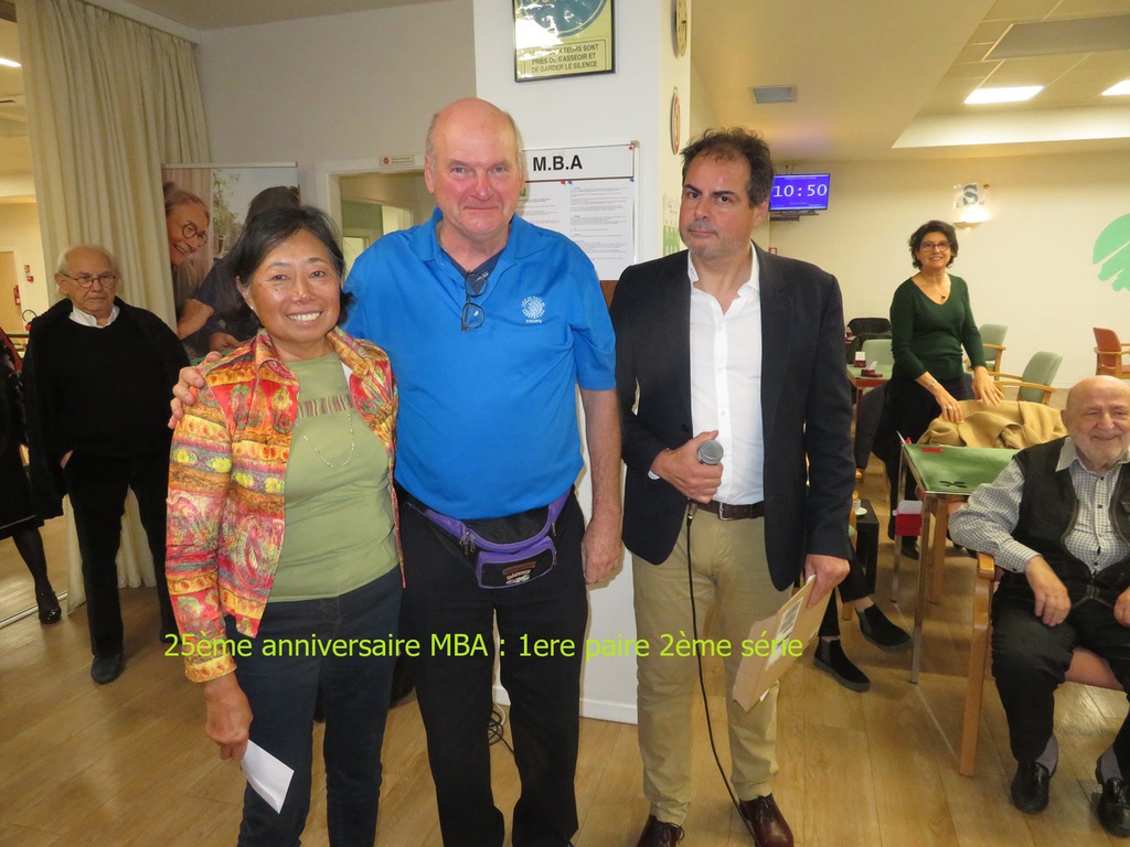 Cette soirée était réservée aux bénévoles. Ils ont pris place autour des tables et ont dégusté des tartes flambées en racontant les uns aux autres tout ce qu'il avaient appris au fil de ces deux semaines...Quelques chmpions sont venus nous saluer...Eric Laurant, Président de l'European Bridge League, et Frank Riehm, Président de la FFB, ont remercié tout le monde : Tout d'abord Martine qui a tout organisé, les opérateurs (Anne-Marie, Catherine, Colette, Arnaud) les duplicateurs (Lucile et Rémy) tous les caddies et enfin l'équipe italienne et portugaise d'arbitres et d'organisateurs et bien sur Jean-François Chevalier pour la partie FFB...
